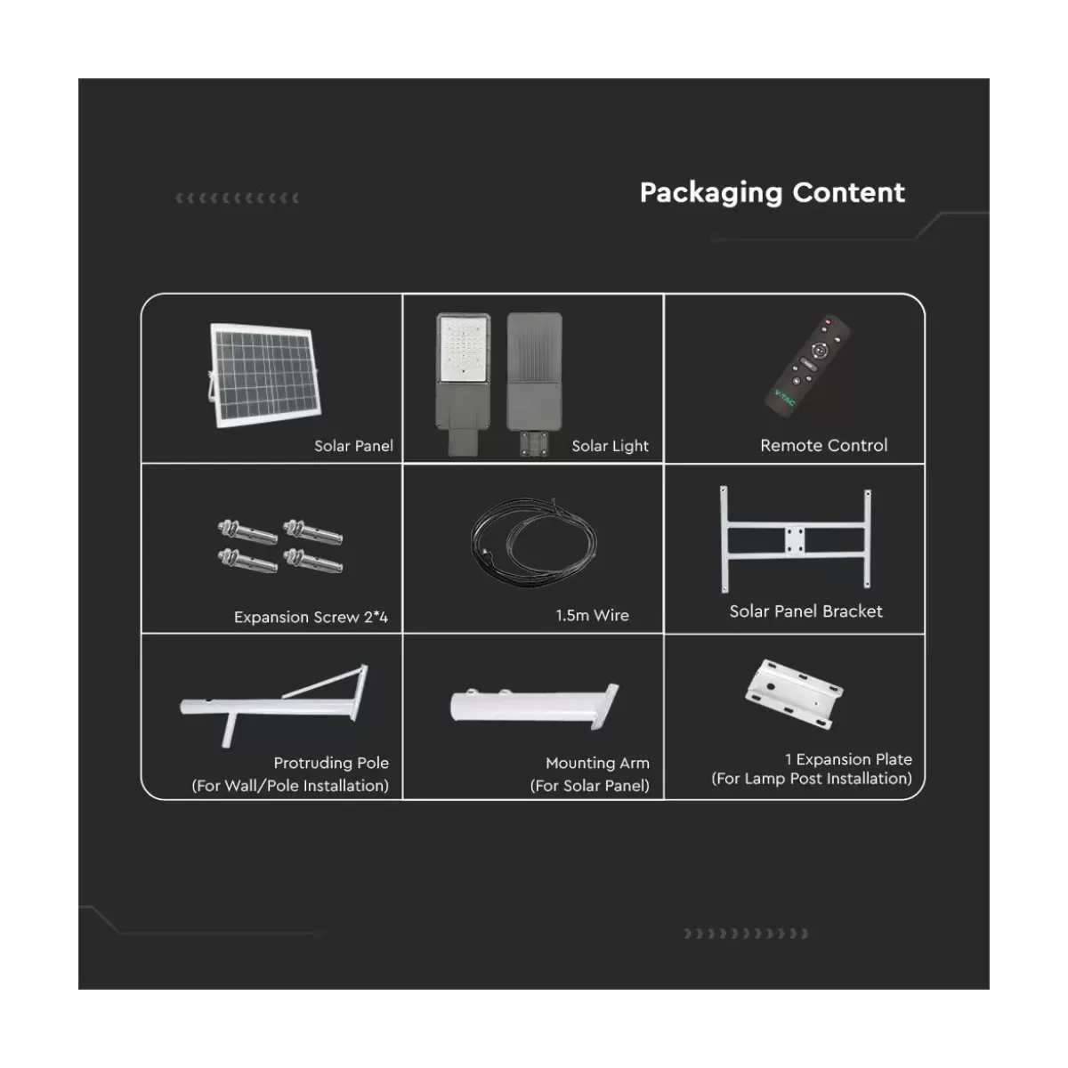 Questo lampione è fornito di una protezione IP65, che lo rende resistente alla polvere e all'acqua, garantendo la massima durata anche alle condizioni atmosferiche più avverse. Il facile sistema di installazione permette il montaggio su palo o a parete, offrendo flessibilità nel posizionamento. La confezione include tutto il necessario per un'installazione veloce, tra cui braccio di montaggio, staffa di supporto per il pannello solare, viti di espansione e una piastra di espansione. Inoltre, un cavo di collegamento di 1,5 metri facilita il posizionamento del pannello solare per un'ottimale esposizione alla luce solare.